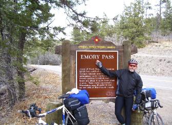 We're over the hump! Today we took on the best that the southern Rockies could throw at us and made it our bitch! The climb to the 8300 ft Emory Pass was the most relentlessly grueling cycling that I have ever done, notwithstanding the less than sage advice from the slack jawed yokel from a couple of days ago. On the way up to the pass we encountered unrailed drop-offs, steep grades, snow (finally!) and the biggest damn hole in the world. Obtaining the summit was truly one of the great moments of my life. As often happens, this fleeting elation was quickly followed by one of the most boneheaded moments of my life. On the descent, about 8 miles at 6% grade, I thought Fred was being too cautious; I had to play racer boy and try to double the posted speed limits on the curves. Howling like the perfect idiot that I often am, I made the first 4 with aplomb, picking the perfect line and indeed doubling the 10, 15 and even 20 mph postings. Then came the 5th, a decreasing radius 'U' at a posted 15. My great line was interrupted by gravel and frost. Instead of laying it down, I straightened up and rode off the outside of the turn, into a snowbank. I should have ended up dead or at least maimed but the bike rider gods took pity on the fool; nothing more than a bent and scratched brake lever. Dr Fred, wise and perfect friend that he is, refused to upbraid me like I deserved and the rest of the descent was accomplished at 50 year old touring bike guy speeds. Kids, don't try this at home. OK, JTV